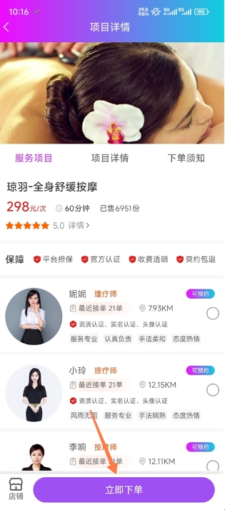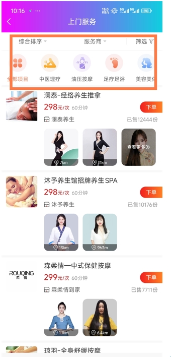 1、上门服务:可以根据自己的身体情况,选择适合的按摩项目,可以查看项目介绍,可以筛选服务商,按销量排序,按评价排序,按好评排序。