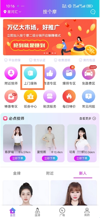 3、附近技师:借助地图和定位功能,你能迅速找到距离近、上门快的技师。提供地图模式和列表模式两种展示方式,满足你的不同查看需求。
