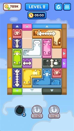3、当方块移动到对应颜色的区域后猫咪就可以离开,当所有方块里的猫猫全部逃脱后就可以通关。