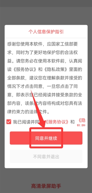 1、进入录屏助手后确认协议,点击继续。