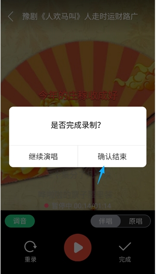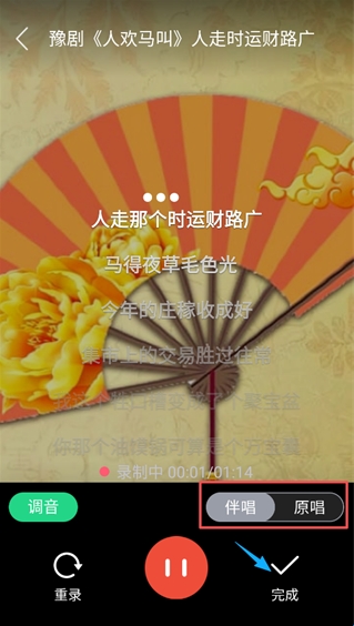 4、录制时,可以自行选择是否有原唱,完成后,点击屏幕游戏角的“完成”。