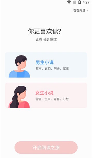 1、下载打开软件,选择男生/女生类型,开启阅读之旅;
