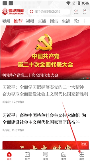 1、打开晋城新闻网app,进入首页后点击下方选项中的“服务”模块;
