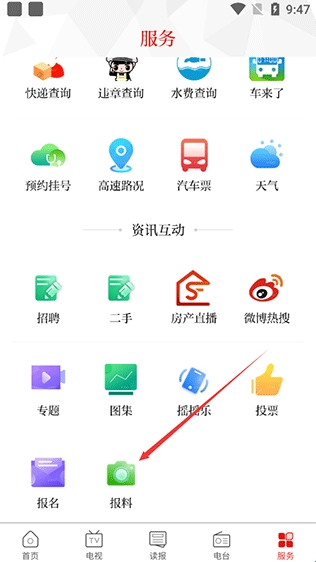 2、在“服务”页面中拥有许多的生活服务,如电视缴费、图书借阅、周边游等等,如需投稿爆料仅需下拉找到“爆料”点击进入;
