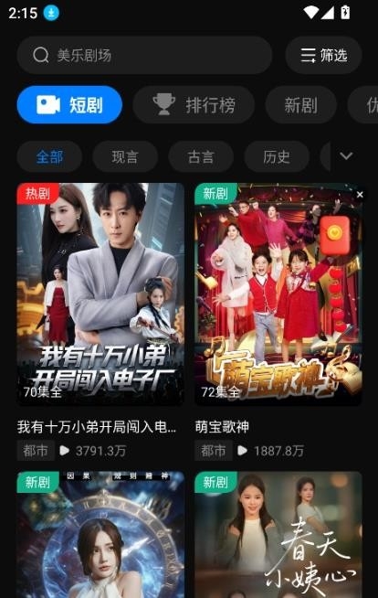 美乐剧场app是一款非常好用的短剧播放软件,这款软件拥有丰富的短剧资源,总裁豪门、重生复仇、古风权谋、温情年代等各种风格类型的短剧资源应有尽有,满足用户多样化的短剧观看需求。在这里用户可以直接滑动屏幕选择你喜欢的短剧内容,也可以将它收藏起来方便后续观看,感兴趣的朋友们快来下载体验吧。