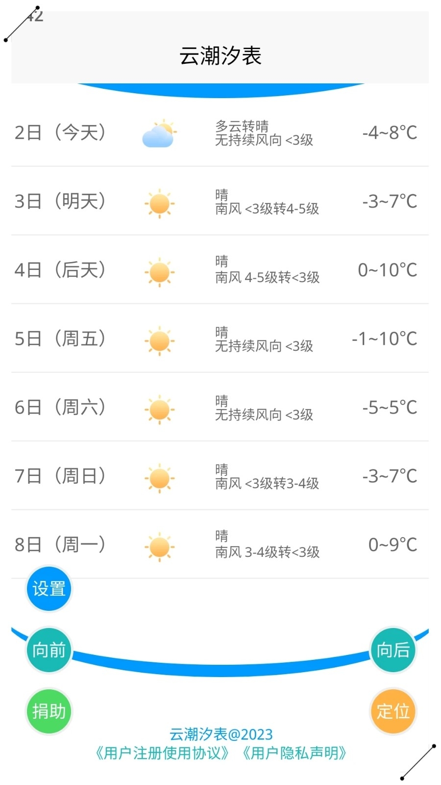 云潮汐表,是一款能够精准推算出潮汐起伏的推算工具。软件有着强大的定位功能,可以根据用户的选择或当前位置精准搜索当地的天气,潮汐等预报,你可以自由挑选附近的港口,检测软件是否准确。多种使用方法,实时推送最新消息,是你的旅行必备神器。有需要的小伙伴,快来网站下载吧。