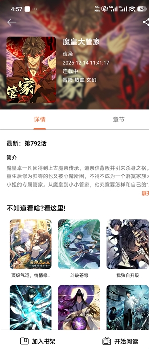 2、点进漫画后能看简介、章节,还能一键加入书架或直接开始阅读。