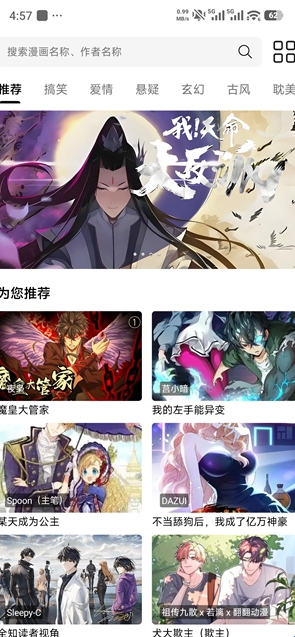 1、进入首页可通过搜索栏找漫画,还能在【为你推荐】区选择各种热门作品。