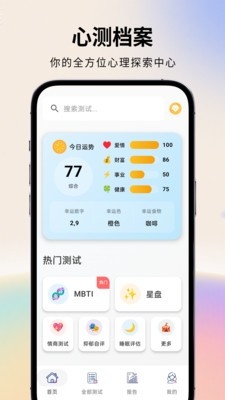 心测档案app是一款非常好用的心理健康管理类软件,这款软件可以帮助用户记录自己的情绪变化,对用户的心理进行分析,让用户可以更清晰地了解自己的性格特点。软件采用了独特的心理测试功能,让用户在剧情故事中做出潜意识的情绪判断,从未得出更权威的测试结果,感兴趣的朋友们快来下载体验吧。
