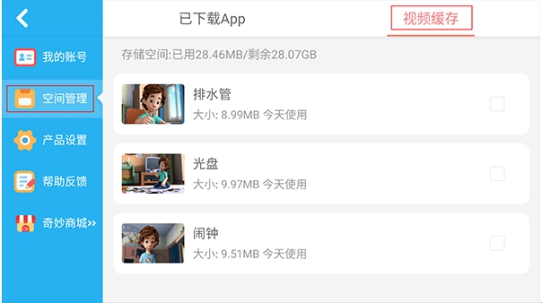 1、进入账号中心页面,点击左侧菜单栏的“空间管理”选项,再点击右上方的“视频缓存”按钮。