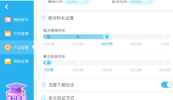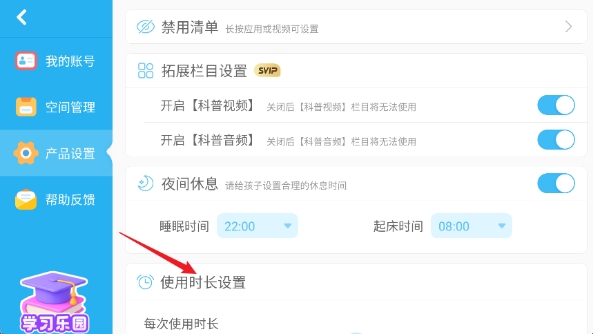 4、找到使用时长设置列表,在该列表下,你可以设置每次使用的时长以及休息时长。