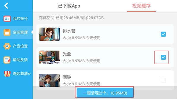 3、找到需要清理的视频文件,勾选右侧的小方框按钮,最后点击下方的“一键清理”按钮即可。