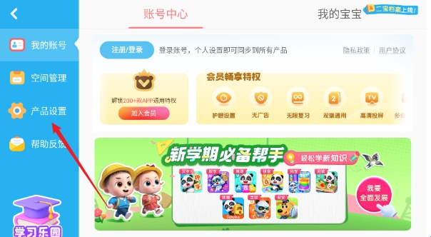 3、进入账号中心页面,点击左侧菜单栏的产品设置”选项。