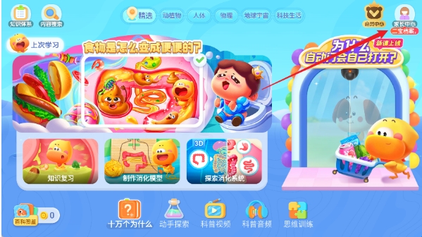 1、打开宝宝巴士科学App,进入用户首页,点击右上角的“家长中心”按钮。