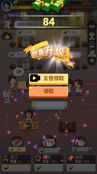 3.如下图所示,玩家可以消耗金币来招募员工、升级厨师烹饪速度等属性,从而提升烧烤店的经营效率。