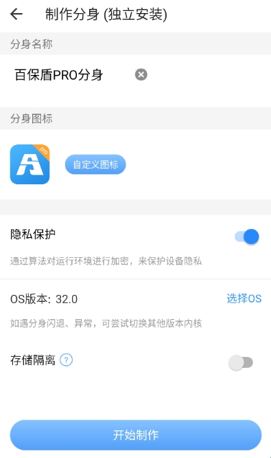 3、输入分身名称、分身图标,选择OS版本,目前可用插件有限,包括机型伪装、虚拟定位、分身锁。