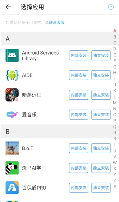 2、点开加号以后会显示你自己手机里的软件,点击字母选择软件制作相应分身。