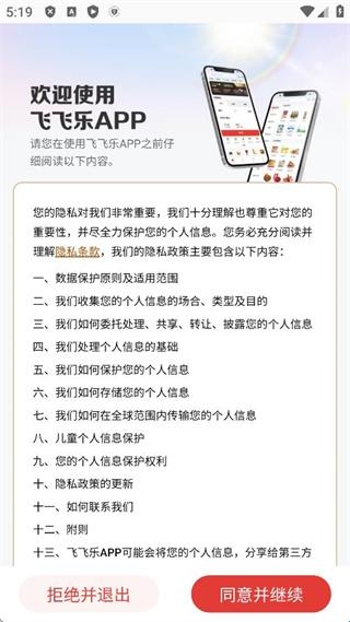 1、安装飞飞乐app后,打开应用,选择“同意”安全隐私协议。
