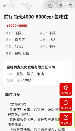 4、进入具体岗位详情页,点击“申请岗位”按钮投递简历。