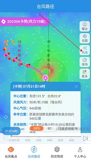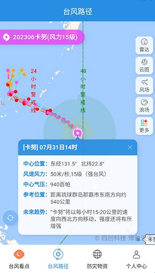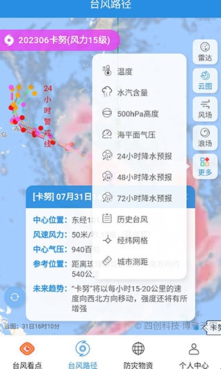 3、台风列表:显示当前西北太平洋活动的台风路径信息,可同时叠加历史台风、雷达图、卫星云图等气象资料。