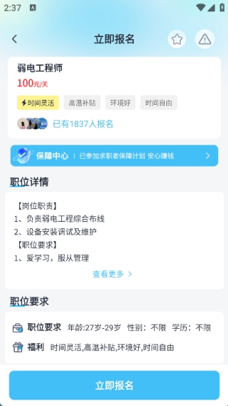 3、在具体工作详情页可查看完整的岗位描述与要求,支持一键立即报名。