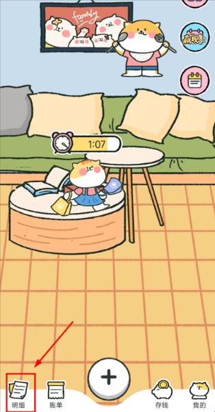 1、下载登录喵喵记账app,点击首页下方的【明细】