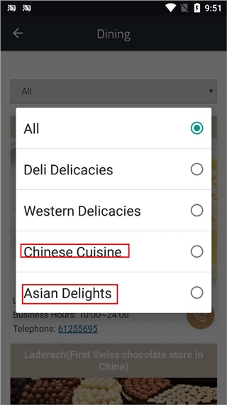 4、点击Dining,可以查看大厦内所有的餐厅及其营业时间、电话等;