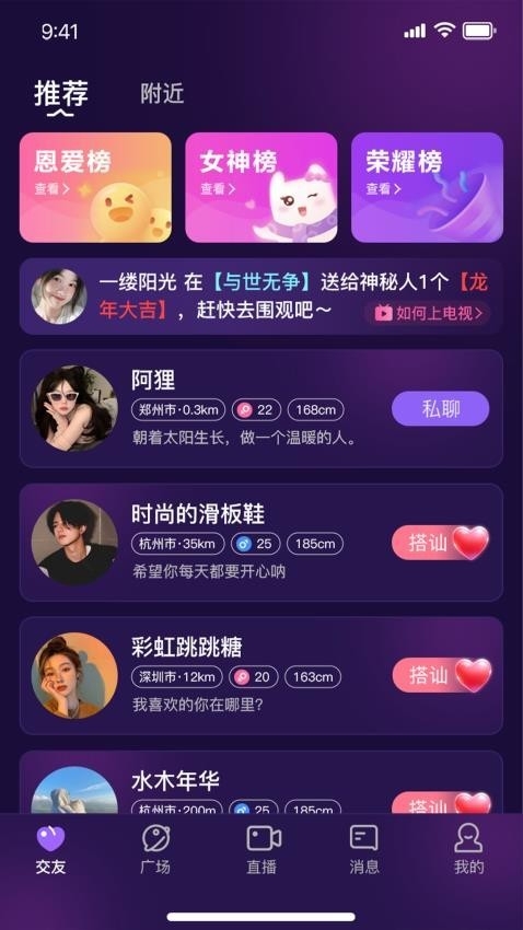 智能推送同城附近网友,便于找到心动的异性可以直接互动并约到线下见面。