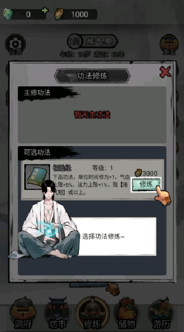 2、点击选择功法,点击选择修炼,收集更多更好的功法来择优修炼,突破你的技能。