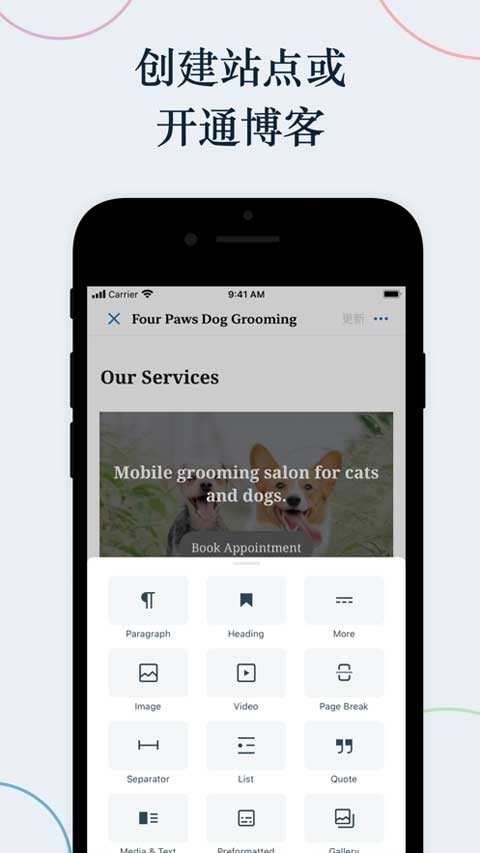 -使用相机和相册中的照片和视频来生动呈现文章和页面,或者通过应用内置的专业摄影图片库(免费使用)找到最理想的图片。