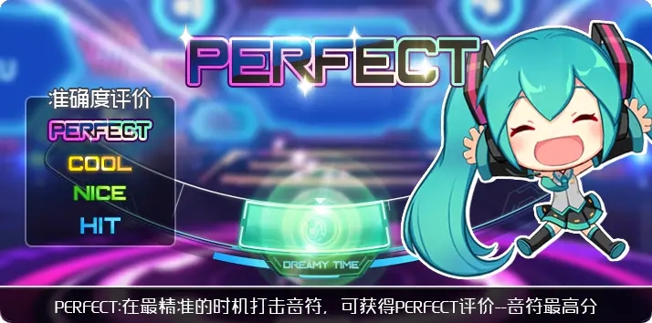 1、Perfect:玩家在最精准的时机点击音符即可获得,时机越精准,越容易获得最高分数。