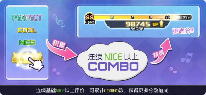 3、当玩家连续击出nice及以上评价,可以累积combo(连击数),combo越多、玩家获得的分数加成越高。