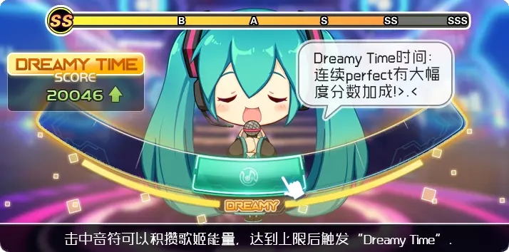 4、DREAMY TIME:连续点击音符可以积攒歌姬能量,达到上限后可触发“歌姬时间”,在D-time期间,连续几种perfect判定,将有大幅度的分数加成效果。