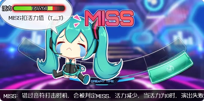 2、当玩家错过音符打击时机,会被判定为miss,活力减少,当活力为0时,就会导致演出失败。