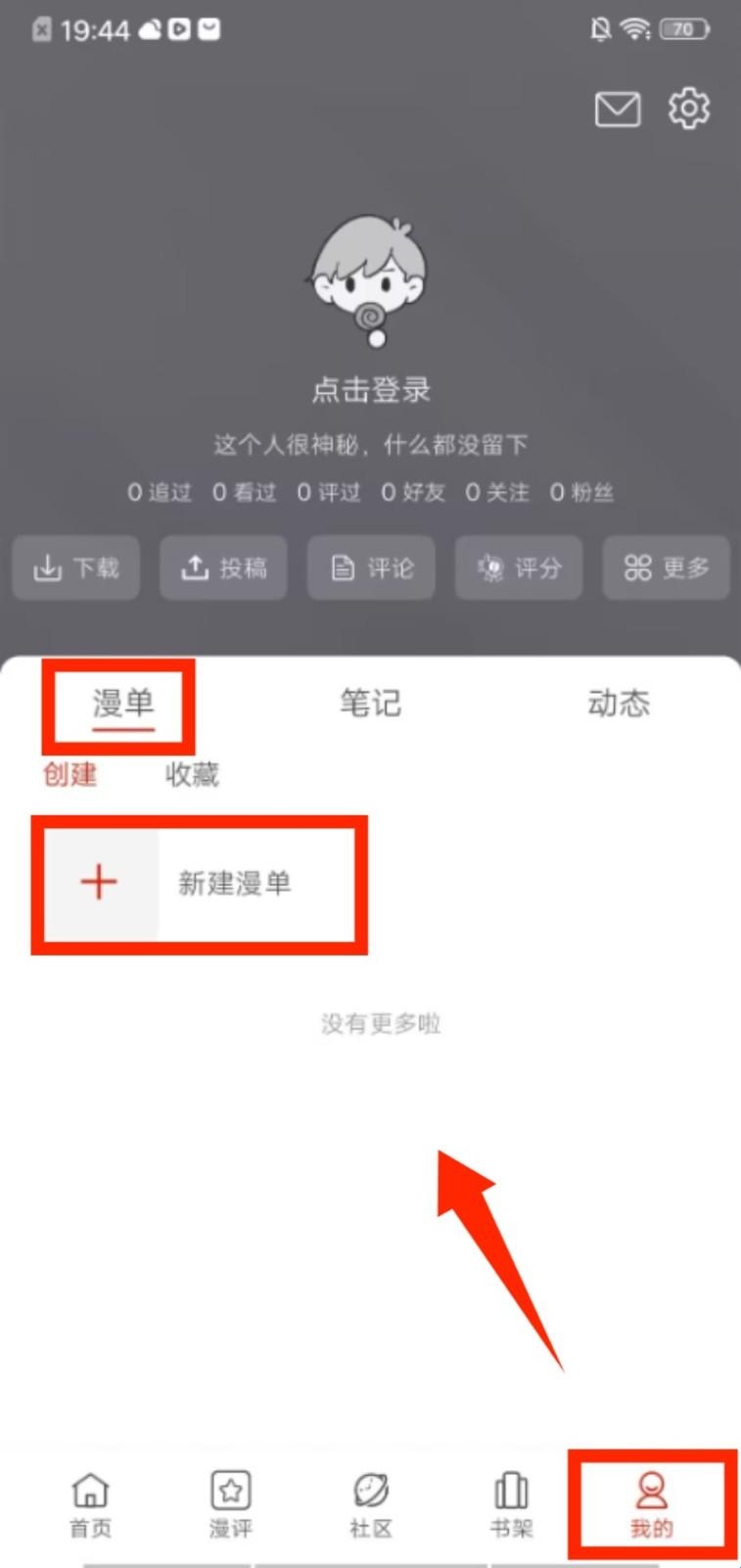 4、进入 “我的”页面,在漫单板块点击 “新建漫单”,可创建专属的漫画收藏列表来整理作品。