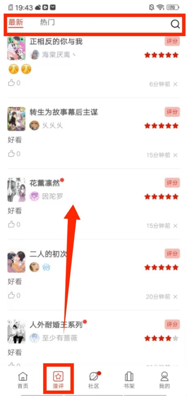 2、切换到漫评页面,在 “最新”“热门”标签下,可查看其他用户分享的漫画评价与推荐内容。