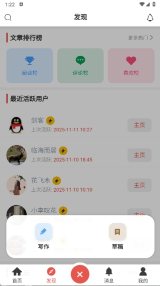 2、发现页面有文章排行榜,最近活跃用户去了解,及时方便去掌握的。