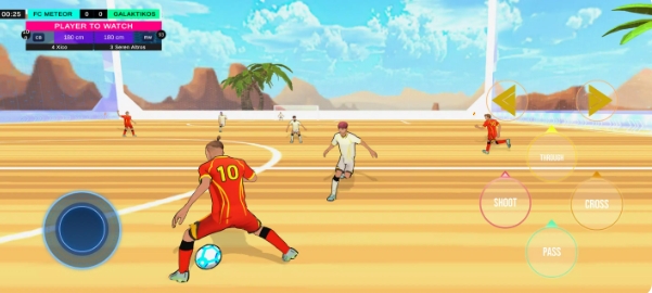 1、通过虚拟摇杆控制球员移动,点击专门的按键进行传球、射门以及施展特定的花式动作。