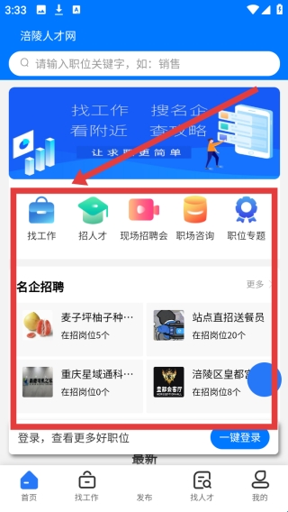 1、功能模块丰富,找工作、招人才等图标醒目,还有现场招聘、职场咨询入口,名企招聘区罗列当地企业岗位,像麦子坪柚子等。