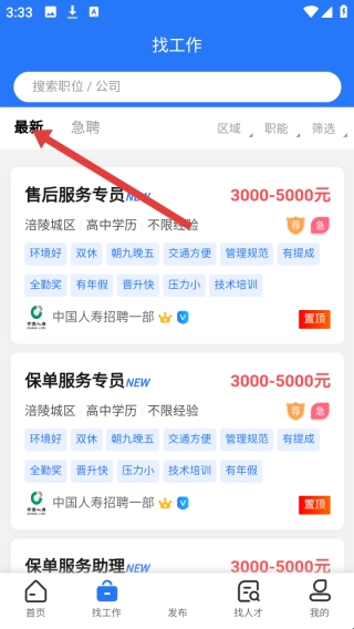2、找工作页面最新标签优先呈现刚发布岗位,售后服务专员、保单服务专员等职位,标注薪资、要求,还有企业福利。