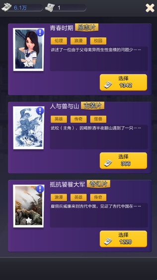 游戏提供海量剧本,涵盖爱情、动作、古装、喜剧等各种类型,从经典港片到好莱坞大片,应有尽有。玩家可以根据市场趋势和观众喜好,选择合适的剧本进行拍摄,体验从剧本创作到电影上映的全过程。