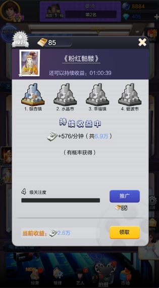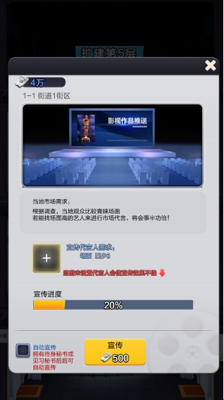 3、强大市场营销:游戏的市场是根据现实城市设计的,通过明星路演、营销活动等手段占领市场,造成影响力,提高票房收益。