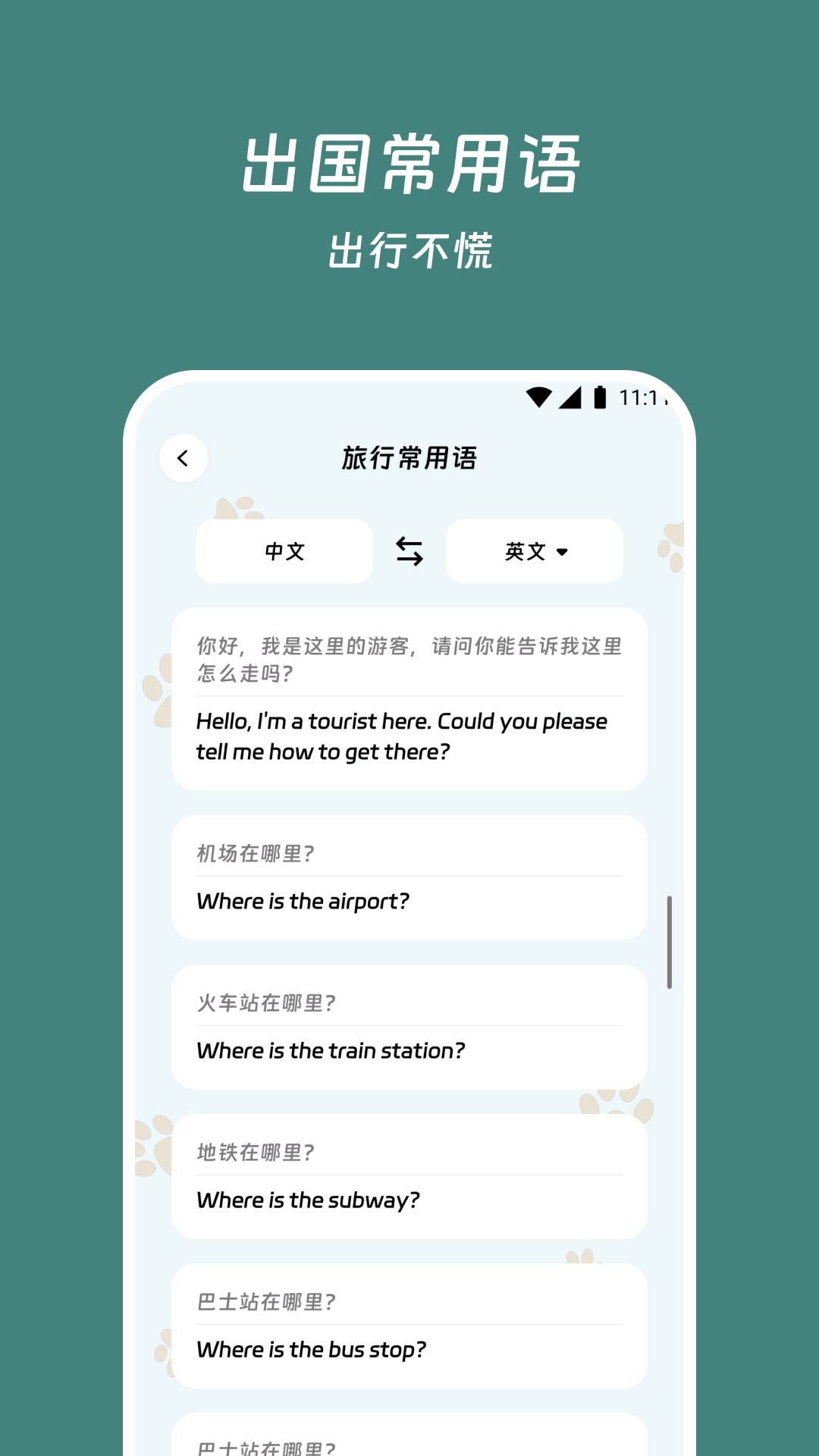 3.出国旅行通用的语言库,在其中涵盖交通、住宿、餐饮、购物等场景。
