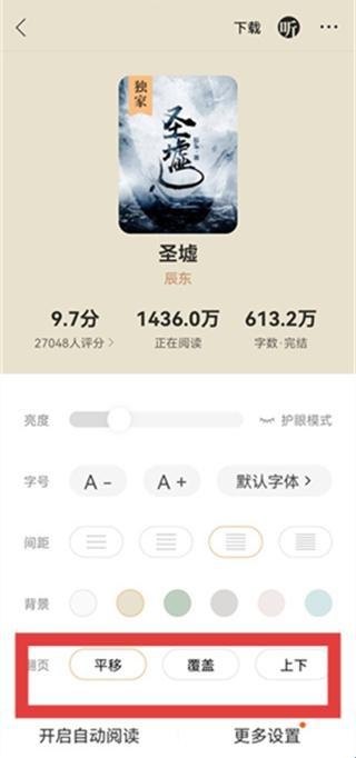 3、在设置菜单中,选择翻页方式,如点击翻页、平移、覆盖、上下等,进行相应设置。