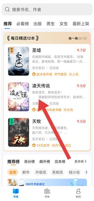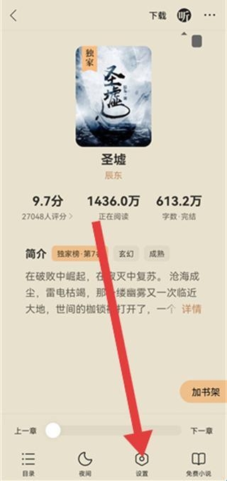 1、在小说APP书城页面,点击要阅读的小说,如圣墟,进入阅读界面。