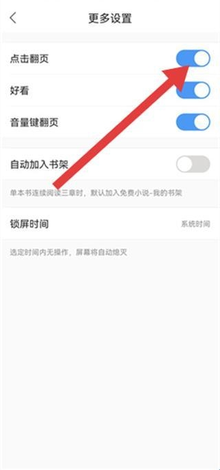 4、在更多设置页面开启或关闭点击翻页、音量键翻页等功能,即可完成翻页方式设置操作。