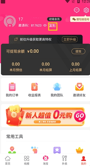 1、打开软件,在“我的”一栏中找到并点击黄色方框内的“复制”按键;