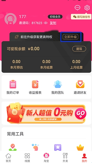 1、打开软件,在“我的”一栏中找到并点击蓝色方框内的“立即升级”按键;
