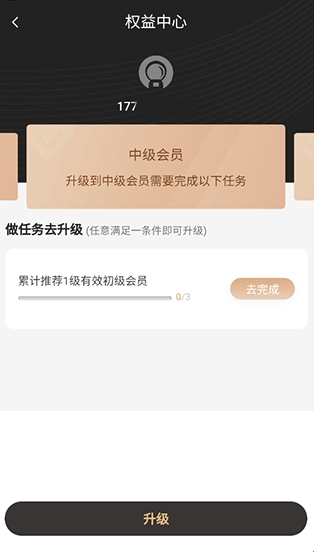 3、点击去完成,软件即可把你带到具体任务界面,在完成任务后再次来到这个界面就可以点击下方的“升级”按键了。