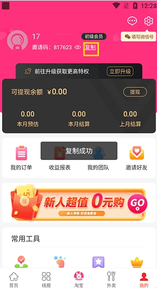 2、当屏幕中出现“复制成功”字样时,就可以在下次注册其它账号的时候粘贴复制的邀请码了。